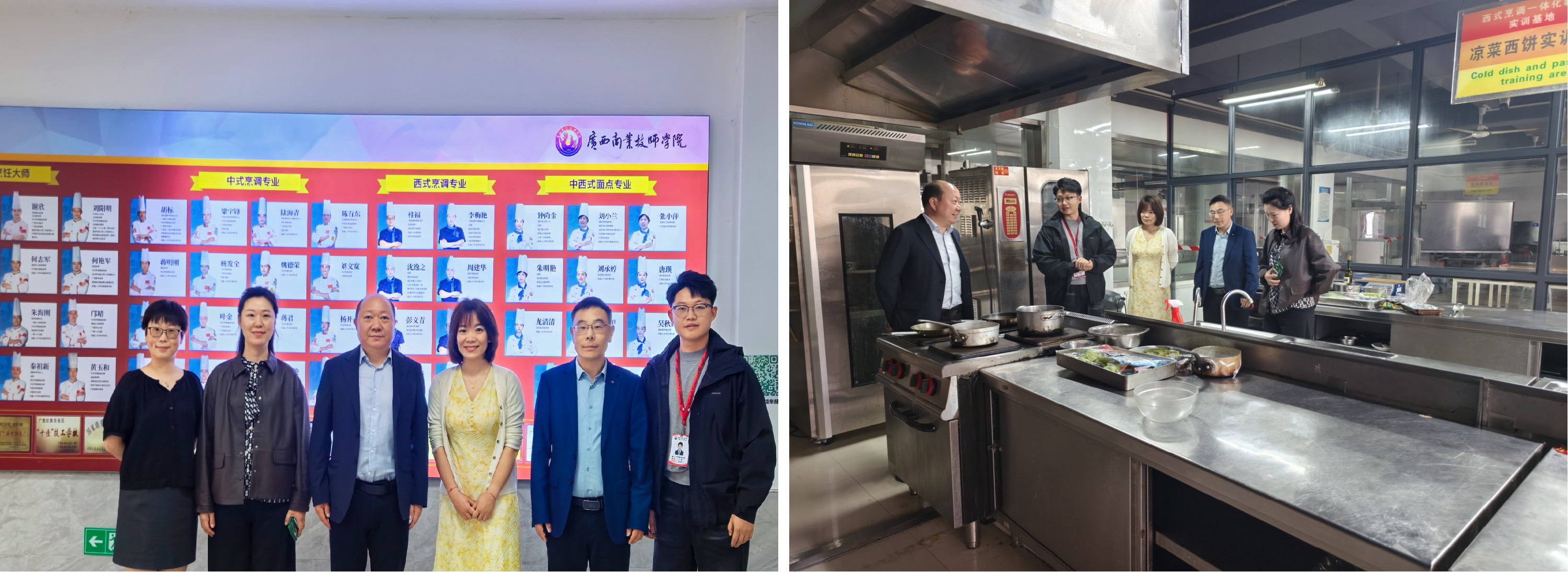 在广西商业技师学院调研过程中,安进等人走访了该校烹饪实训基地,深入学习了其理实一体实训室建设模式及技能大师工作室“师带徒”机制,我校酒店学院负责人表示将借鉴其实训室建设的优秀经验升级改造我校智慧烹饪实训室。