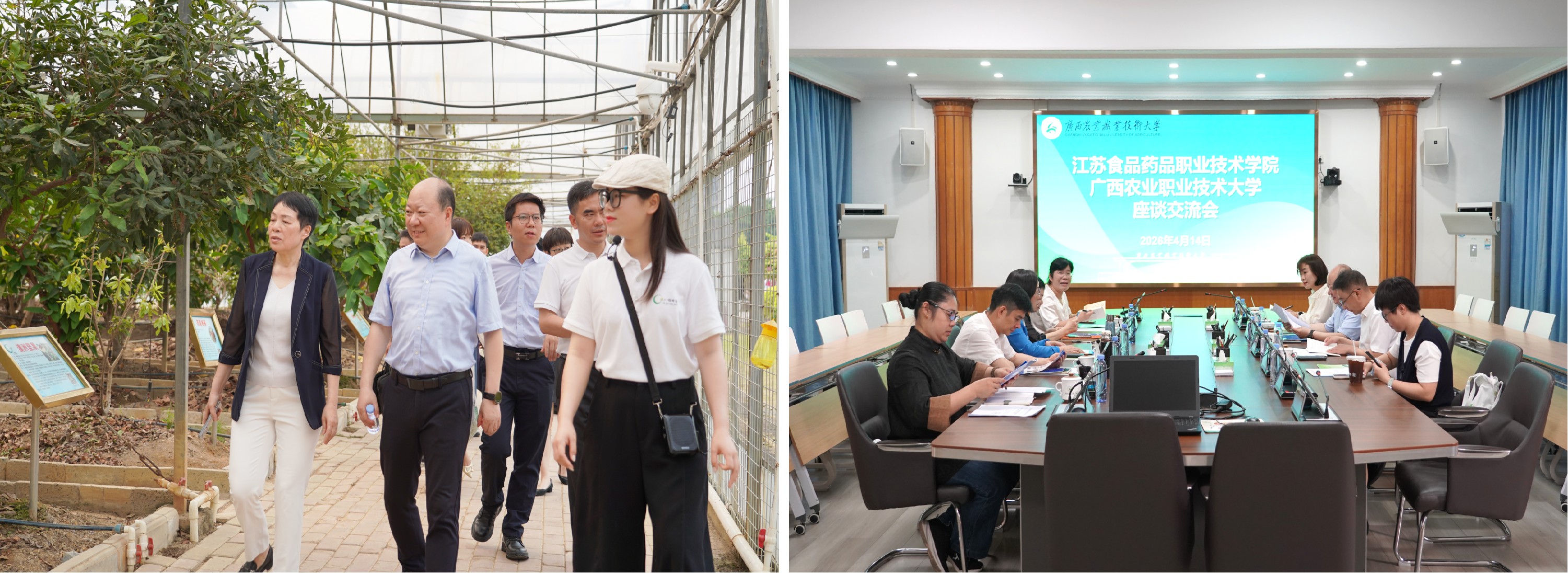 在广西农业职业技术大学调研过程中,安进一行实地走访了该校食品药品工程学院八桂啤酒果醋生产车间,听取了该院阮碧芳副院长介绍的依托广西优势水果资源开展果酒及果醋生产型实训的实例和校企合作共担中试成本的机制,参观了该校获批的教育部首批校企共建“大思政课”实践教学基地“八桂田园”,探讨了从农田到餐桌“全产业链”产教融合人才培养机制。随后的座谈会上调研组听取了李向红校长关于职业本科学校和专业的建设经验,对李校长指出的要回答好高职专业升级职教本科的“必要性、适配性和可行性”三个关键问题表示赞同。