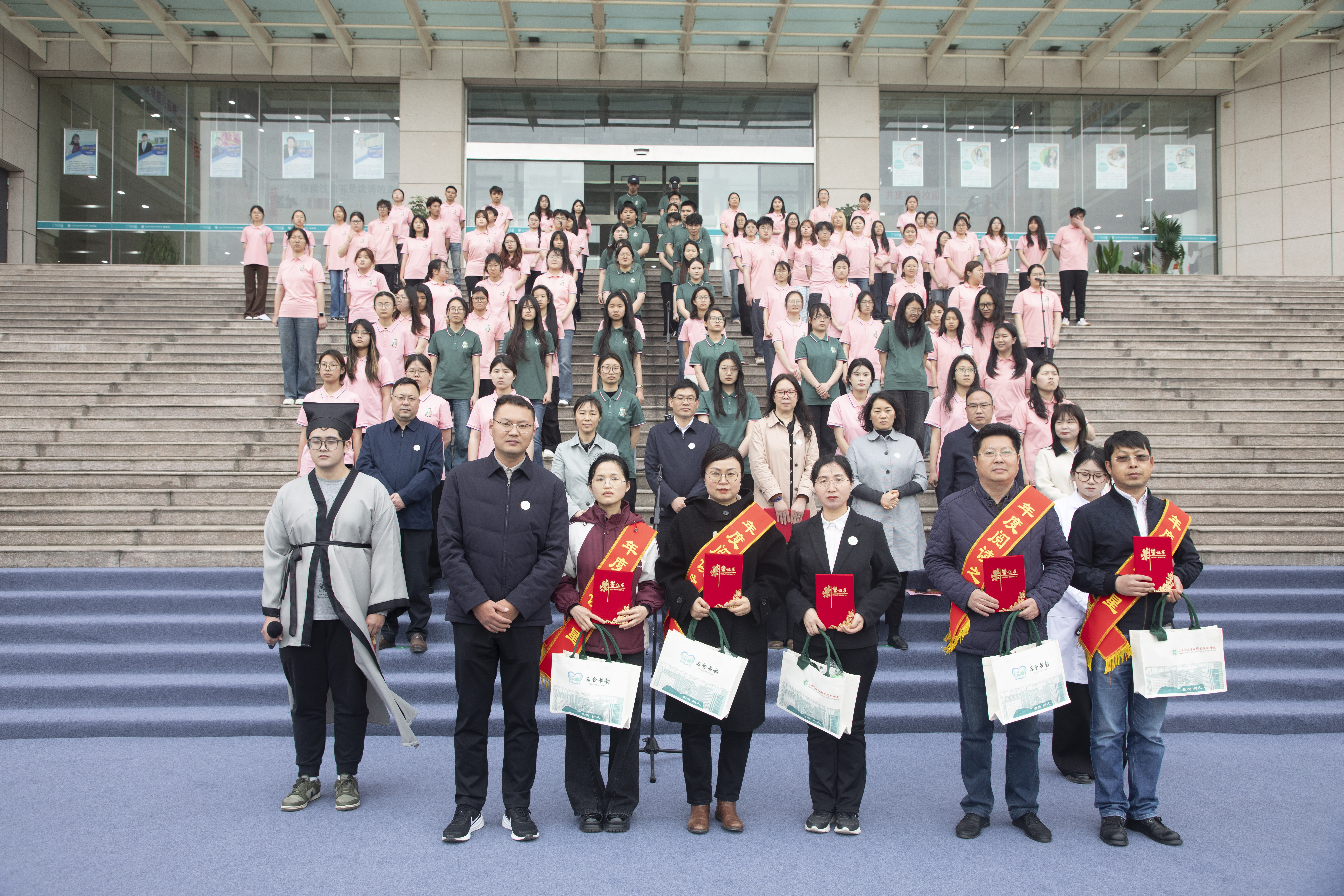 活动特别邀请了25名在世界读书日(4月23日)当天生日的师生上台,焦宇知为他们送上精心准备的生日礼物,并共同切蛋糕庆祝。师生在书香中感受校园大家庭的温暖,留下难忘的集体记忆。仪式后,数字经济学院学生团队带来了《本草纲目》经典诵读表演。演出既有对古籍经典的敬畏传承,又融入了当代青年的创新表达,让沉睡千年的文字在书香校园里焕发新生,赢得了现场师生的热烈掌声与高度赞誉。此外,图书馆在北门广场举办了资源集市活动,通过寓学于乐的形式,向师生们详细介绍图书馆各类数字资源、纸质资源的用途和使用方法。